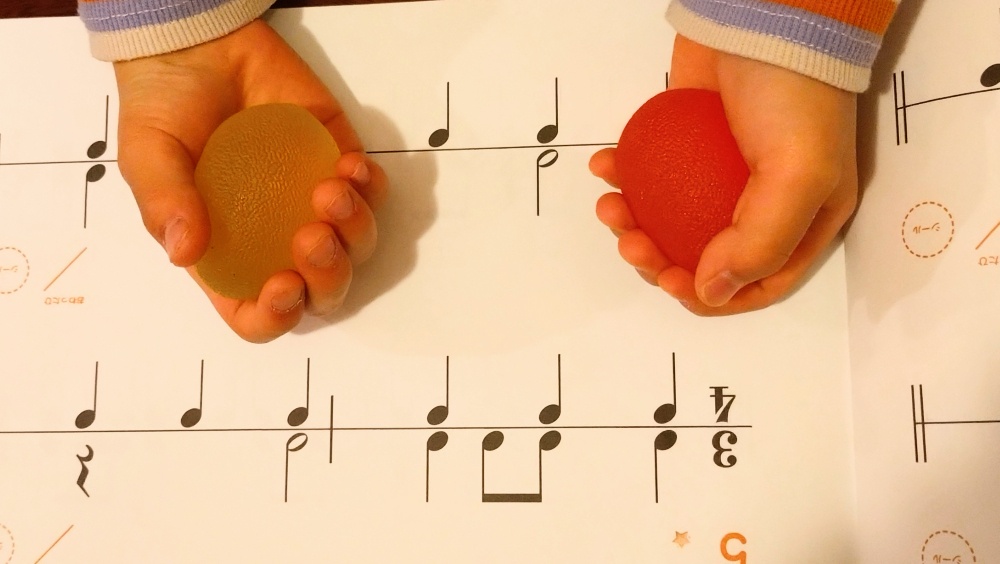 3つのボール、微妙な硬さの違いが分かるかな?手の感覚に集中して当ててみよう!
